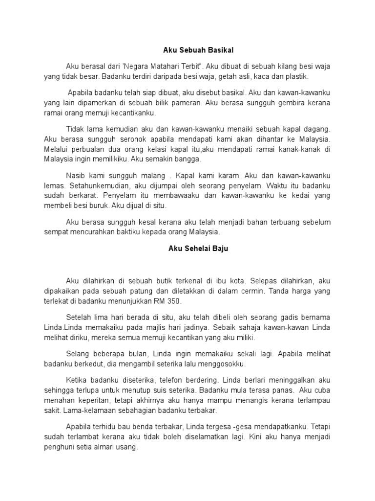 Contoh Karangan Aku Sebuah Basikal Aku ialah sebuah basikal yang berjenama Dorris. Baca versi flipbook dari 74 contoh latihan karangan UPSR. Badan saya dipasang dengan dua tayar.