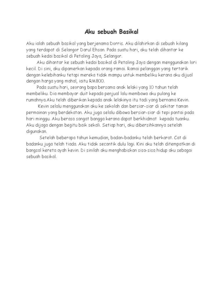 1 P a g e Contoh Karangan Aku Sebuah Basikal Aku ialah sebuah basikal yang berjenama Dorris. Ramai pelanggan yang tertarik dengan kelebihanku tetapi mereka tidak mampu untuk membeliku kerana aku dijual dengan harga yang mahal iaitu. 2 from contoh karangan hobi saya menunggang basikal.